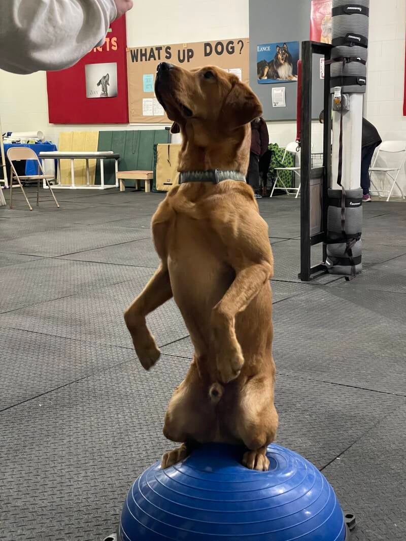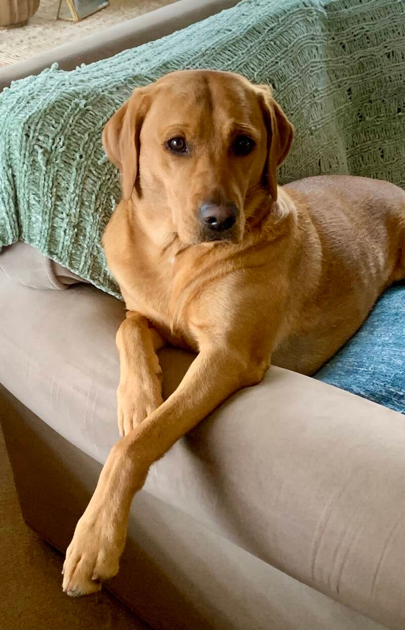 "Growing up I didn’t have a dog and when my partner convinced me to get a dog we decided a red lab was what we wanted for our future family member. We found Maple Creek Kennels on a Facebook group at the end of 2020/beginning of 2021. We were the second pick for the male puppies. When it came time to choose our puppy Emily put all the available male pups on one side of the enclosure and the red collar puppy went right to my partner and laid underneath him. We tried a temperament test on all the available pups (holding them on their back and see who freaked out and who was chill.) I think all the pups were relatively chill but the red collar was just so laid back and he was the darkest and chunkiest, so we picked him.